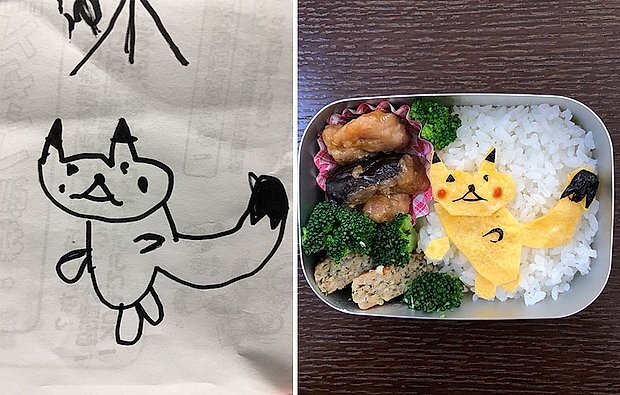 Каждый родитель знает, что заставить ребенка съесть всю порцию целиком - нелегко. Поэтому часто приходится идти на хитрость, придумывать какие-нибудь уловки и уговоры. Но не каждый раз это работает. Сегодня мы хотим рассказать о японце Такафуми Озэки, который является отцом-одиночкой и воспитывает маленькую дочь. Девочка с самого рождения не отличалась хорошим аппетитом, поэтому мужчина придумал, как нам кажется, гениальный способ покормить свое капризное чадо. Так как малышка любит рисовать, Такафуми каждый день берет ее рисунки и вместе с ними отправляется на кухню, где создает настоящие кулинарные шедевры. Готовы взглянуть на них? Посмотрите на этого кота, который так и просится, чтобы его съели. На самом деле Озэки творческий человек и известен японцам по прозвищу "Гусь", мужчина является популярным в восточных странах комиком. Каждый день он готовит подобные шедевры, которые дочка берет с собой в школу на обед. Не только одноклассники, но и преподаватели в восторге от оригинальных