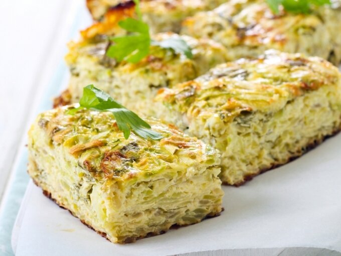 30-40 МИНУТ/120 ККАЛ На 4-6 порций потребуется: Приготовление: Кабачки трем на крупной терке. Поскольку кабачки сами по себе сочные, это стоит учесть. Чтобы потребовалось меньше муки, их лучше отжать от лишней жидкости, используя ее, к примеру, в суп, чтобы не терять полезных витаминчиков и микроэлементов*. Вбиваем три яйца, солим - перчим по вкусу, выдавливаем пару зубчиков чеснока, всыпаем 10 г разрыхлителя для теста и досыпаем муки столько, чтоб по консистенции тесто было как на оладьи. Выливаем тесто в форму, смазанную маслом.