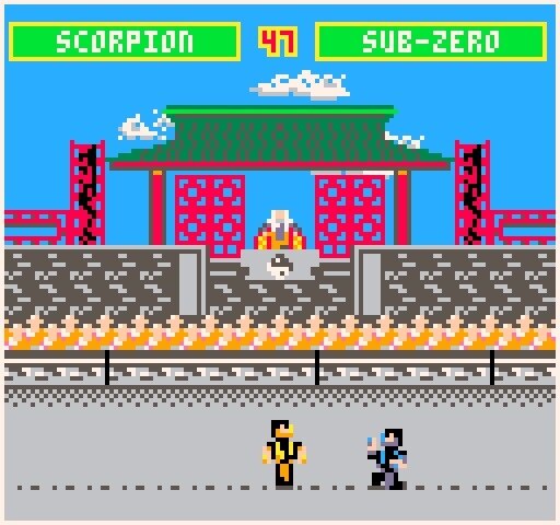 Персонажи... так, что у нас тут? Есть Лю Канг, Саб-Зиро, Скорпион, Рептилия (внезапно, если считать это портом первого МК) иии .. и на этом всё! Набор движений, на сколько я понимаю, у всех одинаковый. можно ходить вперёд, назад, есть присест (абсолютно бесполезный.. впл