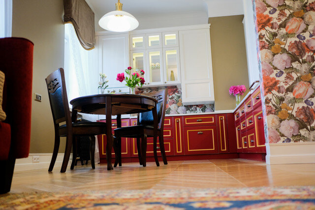 С учётом правил «Дзена» я удалил старые статьи с обзорами наших проектов, т.к. они скопированы с нашего блога «Дневник дизайнера». Теперь хочу повторно их выложить, но с другой подачей и уникальным текстом. Начну с красно-белой кухни, которую я для себя назвал «птица Феникс». У меня именно такая ассоциация, когда я просматриваю фотографии проекта. В принципе цветовая схема соответствует этой птице – интерьер пропитан красно-жёлтыми тонами. Дизайн кухни Дизайн кухни необычный и выделяется из общей массы проектов. Если говорить про стиль кухни, то его определить достаточно сложно. С одной стороны, у кухни классические фасады с элегантной фрезеровкой, с другой – цвета очень яркие и сильные. Есть в этой кухне что-то восточное, что-то китайское. Не знаю почему, но у меня такие ощущения. Много предметов, которые сами по себе харизматичные – обеденный стол со стульями, узбекский ковёр, диван ярко-красного цвета. И что интересно, каждый из предметов имеет собственную историю и отсюда це