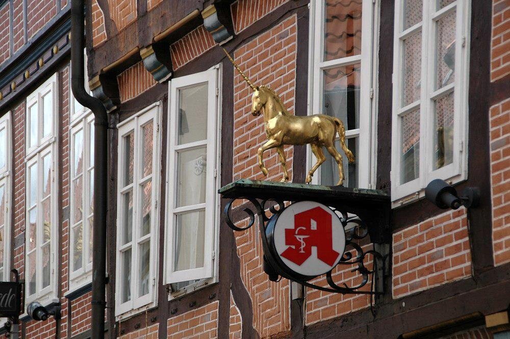 В средние века в аптеках большинства европейских городов прямо под потолком вывешивали диковинные вещицы. Чучела крокодилов, головы носорогов и бивни нарвалов, которые, в те времена, в головах местных, принадлежали единорогам. Не очень то и образованные люди считали, что все эти предметы обладают магическими свойствами. Поэтому такие предметы должны были внушать посетителям доверие к продаваемым лекарственным снадобьям. Вот это маркетинг в те времена был, все для клиента. Со временем в аптеках стали вывешивать рекламу, а изображения мифических животных и приборов алхимиков перекочевали на вывески над дверями аптек. Так, в немецком городишке Штаде, над некоторыми очень старыми аптеками, вместе с классической красной буквой А все еще висят единороги.