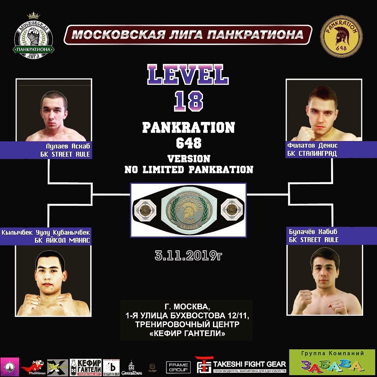Московская Лига панкратиона - Путь единоборца levеl 18 , 03.11.2019г Вас ожидает грандиозное зрелище по панкратиону 648 (2 раунда по 5 мин и финальный раунд до победного окончания поединка без баллов, без времени)! 4 спортсмена из разных клубов, полу-финал, финал! Победитель получает статусный и почетный приз - ПОЯС ЧЕМПИОНА ПО ПАНКРАТИОНУ 648, самому жёсткому виду смешанных единоборств во всём мире!