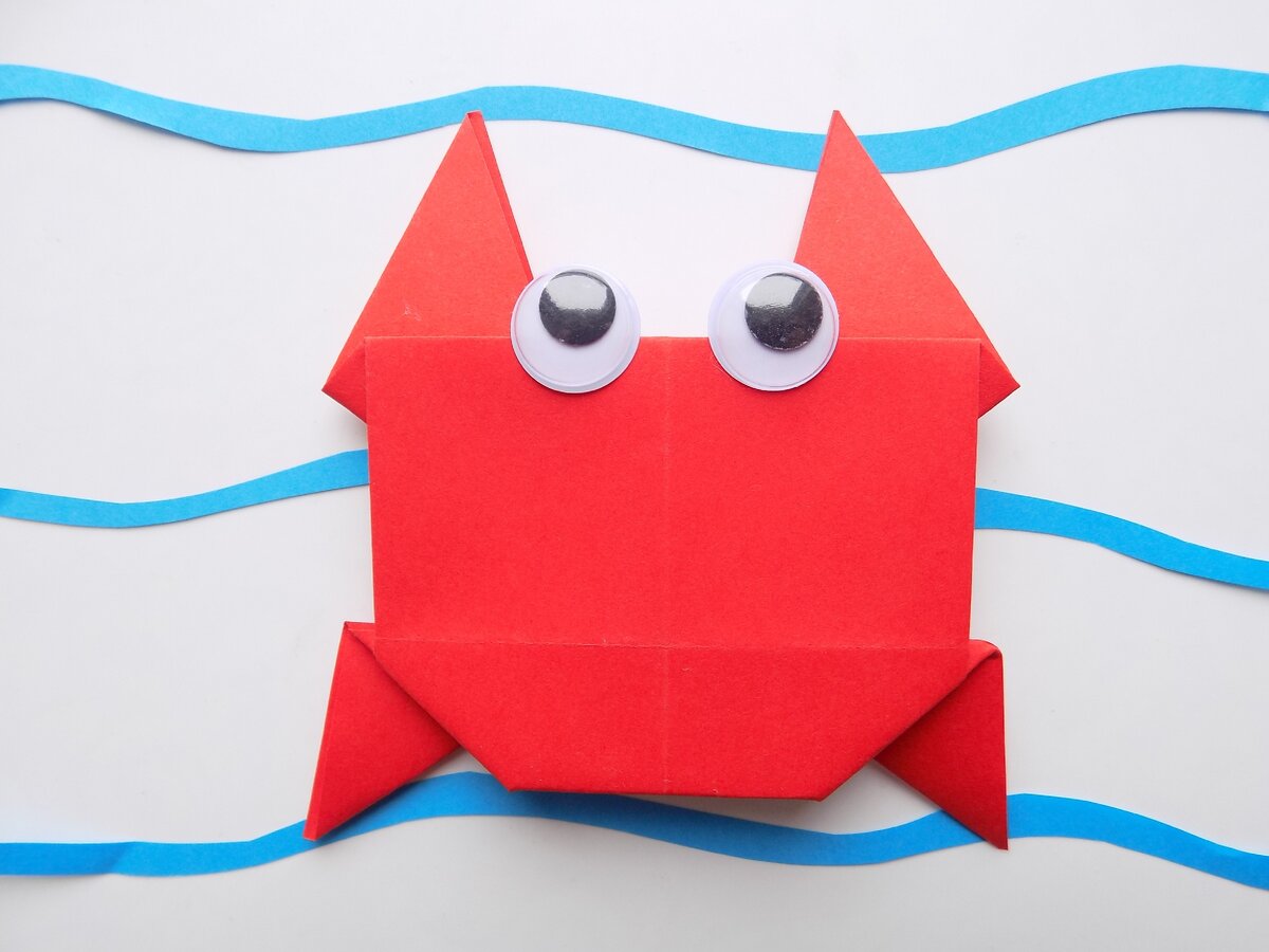 Как превратить простой квадратный лист бумаги в краба? Об этом наш мастер-класс. Для изготовления краба нам потребуется квадрат красной бумаги и глазки с подвижными зрачками. Сначала на квадрате нужно сделать поперечные сгибы, для этого согнем заготовку пополам в разных направлениях. Затем боковые стороны загибаем к середине I Повторим то же самое с другими двумя сторонами. Теперь начнем расправлять верхнюю часть заготовки. Ей требуется придать следующий вид. Аналогичный вид трапеции придаем нижней части заготовки краба. Теперь будем формировать клешни. Для этого загибаем вверх под небольшим углом боковые части. Нижние уголки также требуется загнуть вверх. А потом отогнуть их вниз. Осталось загнуть нижний выступающий уголок, расположенный посередине. Так выглядит наш краб с лицевой стороны. Добавляем ему декоративные глазки. Такой краб из бумаги у нас получился.