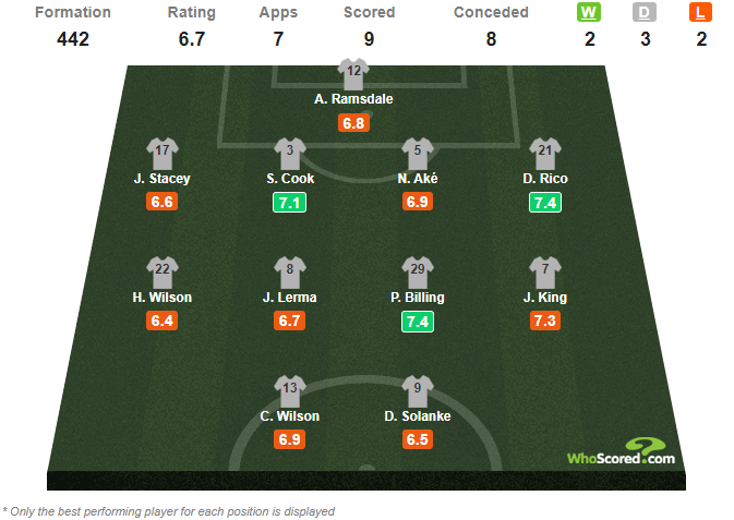 Самая популярная схема "Борнмута" - 4-4-2, которая трансформируется со смещением Джошуа Кинга в центральную зону. Также стоит отметить, что Эдди Хау несколько раз прибегал к схеме с 3 центральными защитниками - с "Сити" (проиграли 1-3) и с "Шеффилд Юнайтед" (ничья 1-1), у которого эта схема (3-5-2) основная в этом сезоне.