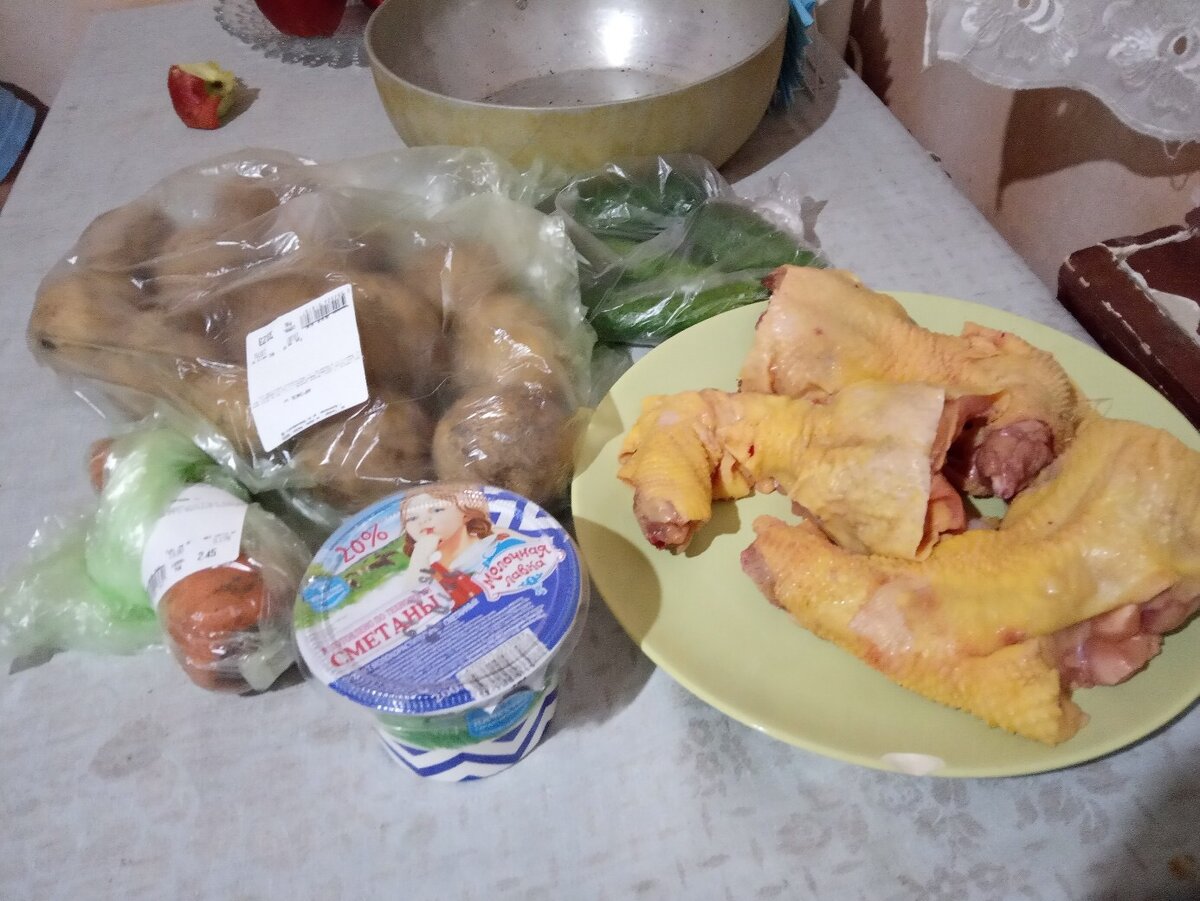 Итак цены: 1. Спинки куриные - 3 жирненьких спинки в магазине вышли на 79.70 р. 2. Картофель- 33 р 3. Морковь - 3 р 4. Сметана -19 р 5. Огурцы 6 шт- 24 р Специи и кастрюля с водой дома были (у тебя и этого нет? Пора задуматься о работе). Кто начнет возмущаться, что в рецепте режется даже кожа со спин - тот пока не достаточно голодный 😂. Приступим? 1. В сотейник/кастрюлю нарезаем спинки и вместе со специями начинаем обжаривать. 2. Через 10 минут добавляем морковь и два зубчика чеснока, предварительно натертые на тёрке. 3. Чистим картошку, моем, нарезаем крупными кубиками. 4. Добавляем всё в кастрюлю, перемешиваем, затем вливаем воду так, чтобы она покрывала картофель. 5. Кладем сметану и перемешиваем. 6. Ждём закипания и на медленном огне все тушим пока картофель не будет готов. В прикуску подаём огурчики ... Малосольные или свежие. Приятного аппетита!