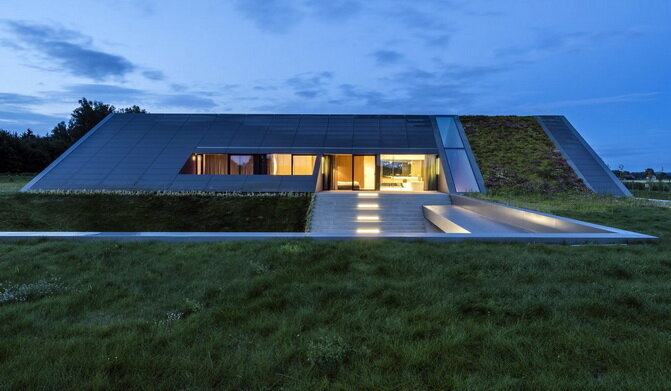 Элегантно и необычно – это про удивительный современный особняк «Green Line», слившийся с природой на берегу озера. Большой и просторный дом, изобилие бетона, стекла и стали аккуратно спрятаны в складках местности и укрыты крышей с пышной зеленой растительностью. Красиво, элегантно, необычно «Слиться с ландшафтом» – это достаточно распространенный прием проектирования загородных вилл, как правило, не очень большого размера. Архитекторы умеют искусно прятать оригинальные «деревянные домики» среди буйной растительности. Гораздо труднее использовать такой прием на почти ровном зеленом поле с минимальной возможностью «вписаться в ландшафт». Польским архитекторам из Mobius Architekci удалось создать удивительную современную просторную виллу и гармонично вписать ее в окружающий спокойный зеленый пейзаж. Особняк с полным названием «Green Line House» (Дом зеленой линии) расположен в Вармии, северо-восточном регионе Польши, известном как «земля тысячи озер». Формально, «Зеленая линия» – это но