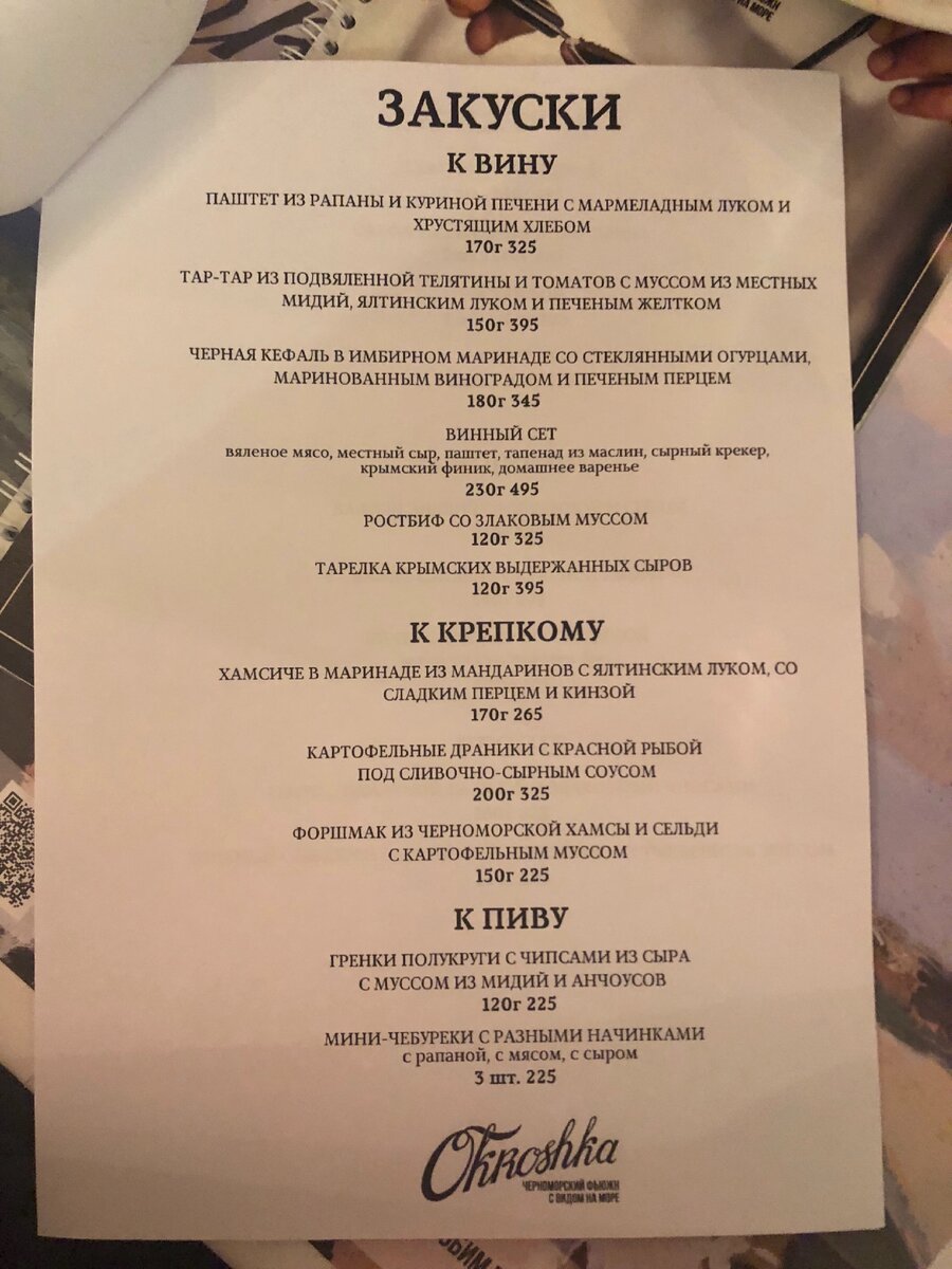 На прошлой неделе пригласили на презентацию нового меню в кафе «Окрошка», я согласился и пошёл тестировать. Это заведение создатели позиционируют как «черноморский фьюжн с видом на море», и на деле это не просто красивое название, а целая концепция. Здесь можно попробовать нестандартные блюда из местных крымских продуктов, а под привычными названиями скрываются свежие интерпретации знакомых блюд. Вроде бы, чем удивить крымчан, предлагая черноморскую кухню? А у «Окрошки» получается. К презентации подготовиди довольно объёмное меню, а новый шеф-повар приготовил интересные позиции с черноморским акцентом. К нашему приходу на столе нас уже ждал сет из брускетт из нового меню: с хамсой и овощами, с кефалью и сливочным сыром и ростбифом. Весь вечер сопровождался дегустацией вин Ярема Акчурина. После лёгкой закуски у нас разыгрался аппетит и мы приступили к изучению тестового меню. Порадовало разнообразие закусок: и к вину, и крепкому, и к пиву. Также, разнообразные брускетты и сэндвичи. Я