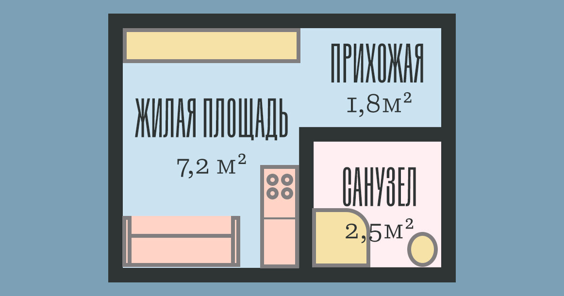 Представили, как могут выглядеть квартиры площадью 11,6 кв. м, которые недавно появились в продаже в Москве и наделали много шуму – составили свой дизайн-проект. За основу взяли реальную планировку от застройщика и попробовали уместить в ней нужные для жизни вещи. Жилая зона Как на схеме расставить мебель не получилось – слишком мало места. В комнате уместился кухонный уголок, диван и комод с телевизором. Всё. Хранить вещи в квартире негде. Если поставить в коридоре шкаф, то проходить в комнату придется боком. Максимум, что может себе позволить владелец квартиры – это напольная вешалка вроде тех, что можно купить в IKEA. На полноценное рабочее место квадратов тоже не хватило. Кухонная зона Кухня получилась функциональная: есть и раковина, и плита с духовкой, и какое-никакое рабочее пространство. Посуду можно хранить в подвесном шкафу. Большой холодильник поставить не получится, а компактный барный можно встроить в среднюю секцию кухонного гарнитура. Санузел Санузел тесный, как и во вс