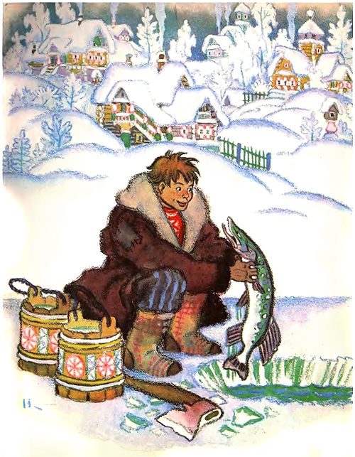 Слез Емеля с печки, обулся, оделся, взял ведра да топор и пошел на речку.