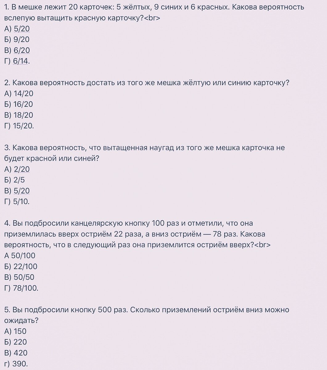 Насколько хорошо Вы разбираетесь в теории вероятности? Предлагаем Вам проверить свои знания в этой сфере и решить 5 лёгких задачек. Ответы приведены в конце. Чтобы увидеть правильные ответы, пролистните стрелку влево. Ставьте палец вверх, если ответили без ошибок!