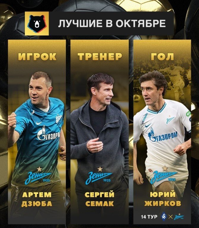Недавно завершилось голосование, которое организовали официальные представители Российской Премьер-Лиги. Всем желающим предложили выбрать лучшего тренера, лучшего игрока и лучший гол в октябре 2019 года. Как показали результаты, все три награды забрали представители питерского клуба «Зенит». Генеральный директор клуба Александр Медведев рассказал, почему именно Юрий Жирков, Артем Дзюба и Сергей Семак стали лучшими. «Награждение Семака, Дзюбы и Жиркова индивидуальными наградами в этом месяце – это объективное отражение того, как играет «Зенит». Сочетание тренерских подходов, самоотдачи игроков на поле и тренировках, атмосферы в команде – все это пока дает промежуточные результаты» Александр Медведев уточнил, что если команда продолжит в том же духе, то сможет повторить грандиозные результаты прошлого года. Главной целью представитель дирекции «Зенита» обозначил – стать чемпионами РПЛ. Но никто не отменял победу в кубке России и максимально возможный результат в Лиги Чемпионов. Нап