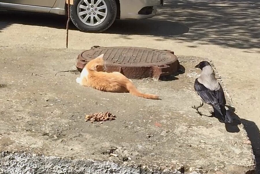 Всегда знали, что серые вороны самые наглые и бесстрашные птицы. Любят они подергать удачу за хвост. Даже если этот хвост принадлежит не им. По своей наглости они уступают разве что морским разбойникам - чайкам. Но в городе равных серым воронам нет. Мы не раз видели как они гоняют белок за орех, но тут под раздачу попал более серьезный соперник. Как он о себе думал. Небольшой тизер к видео: Мы отсыпали немного кошачьего корма одному из наших дворовых любимцев. И пока он раздумывал подходить ему к еде, или может дождаться пока она сама к нему пойдет, к месту кормежки подоспела серая ворона. Сделав вид, что она вообще прилетела попить, и оценив ситуацию, она для начала сняла пробу с корма и одобрив его, принялась избавляться от главного конкурента в этой пищевой цепочке. И на то, как она это делала, без улыбки смотреть невозможно. Её вообще не смущало, ни наше присутствие, ни то что велась видеофиксация этого акта волюнтаризма. Вот же ж беспардонная. ) Смотрите также: Понравилс