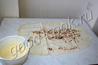 Лаваш развернуть и положить на стол. Намазать творожную массу и свернуть рулетом. Нарезать рулет на дольки толщиной 3~5см. Резать лаваш удобнее кухонными ножницами.