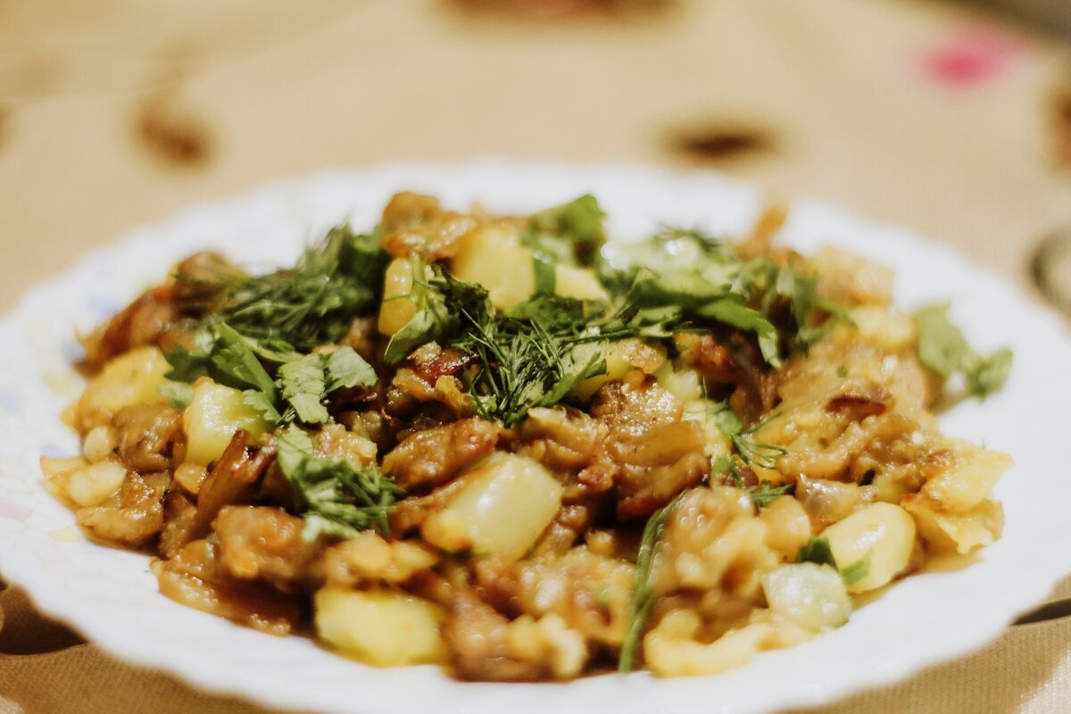 Всем хорошего дня, друзья! Вернулась к Вам с нереально вкусным рецептом - баклажаново-картофельная чыгыртма😍 Для приготовления нам понадобятся: Баклажаны - 1 кг; Картофель - 1 кг; Лук - 1 большая головка; Сливочное масло - для жарки; Специи - по вкусу; Зелень - для украшения. В первую очередь чистим баклажаны, нарезаем их кубиками и солим, оставив на пару минут, чтобы выделилась горечь. Теперь чистим лук и жарим его на сливочном масле пару минут, после чего добавляет наши баклажаны, предварительно слив воду. Когда баклажаны дожарятся, посыпаем немного специями кроме соли и откладываем в сторону. Пришла очередь картофеля. Также нарезаем кубиками и обжариваем на сливочном масле. Теперь добавляем к картошке уже обжаренные баклажаны. Наше блюдо готово! При подаче можете украсить зеленью. Приятного аппетита!🍝