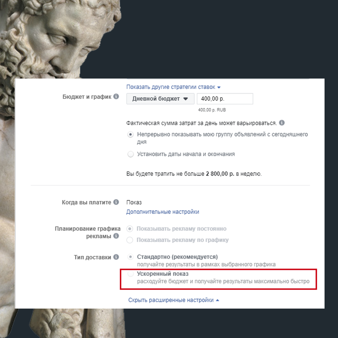 Однако, иногда я использую этот тип доставки в определённых условиях. Когда цена не так важна, как срочность. Например, вы продвигаете мероприятие и хочется охватить как можно больше людей. Также, при выборе цели охват на широкую аудиторию (не ретаргетинг), можно установить предельную ставку и поставить ускоренный тип доставки.