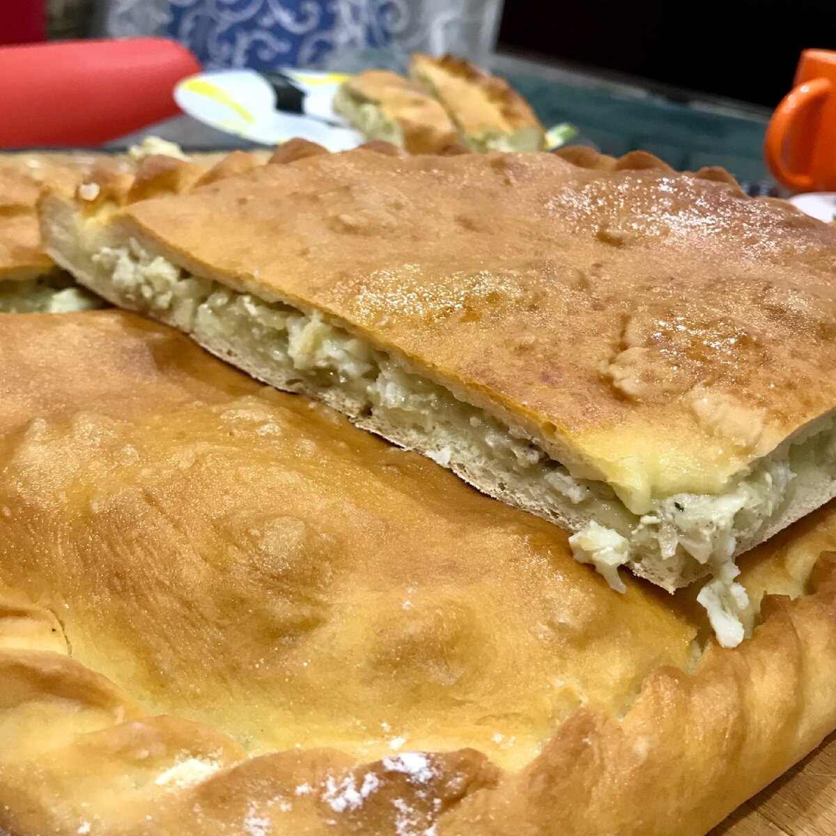 - Далее тесто (про тесто для пирогов будет отдельная статья), разрезаем на две части, побольше и поменьше