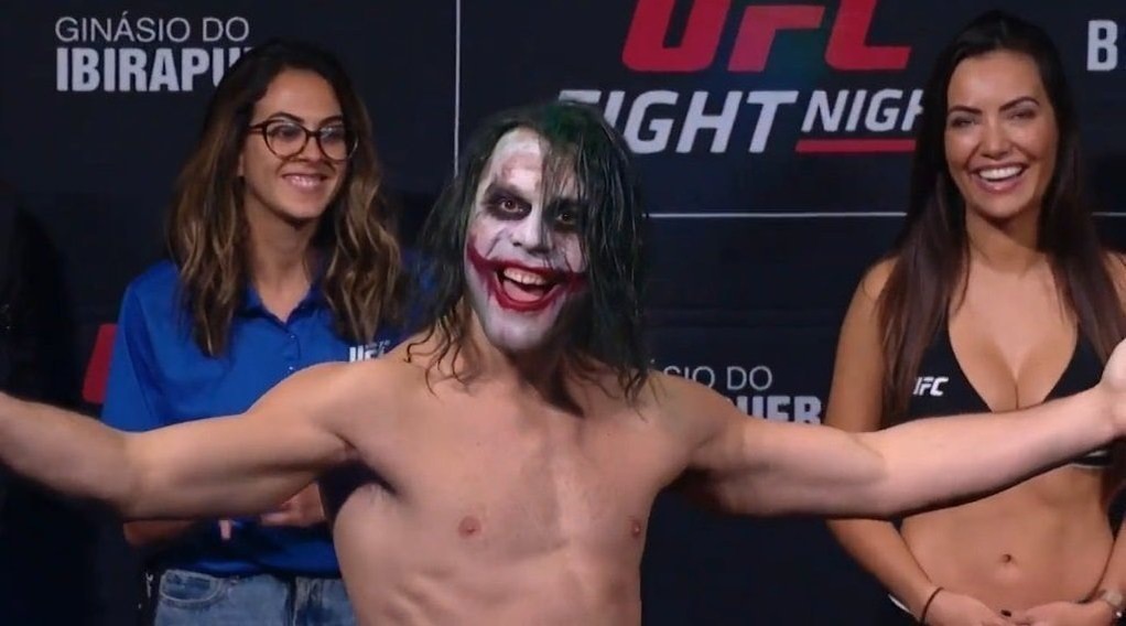 Перес повторил грим и прическу персонажа. Бразильский боец смешанного стиля (MMA) Маркус Перес вышел на взвешивание перед турниром Абсолютного бойцовского чемпионата (UFC) в образе Джокера. 29-летний спортсмен сделал выбор в пользу Джокера в исполнении актера Хита Леджера из фильма "Темный рыцарь". Перес повторил грим и прическу персонажа. Перед выходом на сцену он накрыл голову капюшоном. Зал бурно поприветствовал Переса, когда боец предстал в образе Джокера. Пересу предстоит бой на турнире UFC в Бразилии против соотечественника Веллингтона Турмана. Поединок пройдет в средней весовой категории. Джокер - злодей из комиксов DC. Персонаж не раз появлялся на экранах: в 2019-м вышел "Джокер" с Хоакином Фениксом в главной роли. Также образ примеряли такие актеры, как Джек Николсон ("Бэтмен", 1989 год) и Марк Хэмилл, который озвучивал персонажа в видеоиграх и мультфильмах.