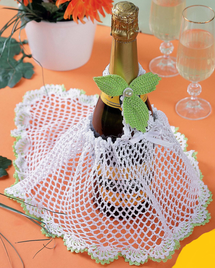Размер изделия зависит от от размера бутылки. Материалы, которые нужны для работы: пряжа (100 % хлопок), 40 г белой, 5 г салатовой; 1 бусина; атласная ленточка; крючок № 0,9. Верхняя часть: пряжей белого цвета крючком № 0,9 набрать цепочку из 38 ВП и замкнуть в круг с помощью соединительным столбиком. Первый ряд: 4 ВП (1 ВП подъёма и 3 ВП), 1 столбик б/н в получившееся кольцо, 2 ВП, * 2 столбик с 2/н в кольцо, между столбиками с 2/н арка из 5 ВП, 2 ВП, 3 столбика б/н в кольцо, между столбиками б/н арка из 3 ВП, 2 ВП **, повторить от * до ** 1 раз, 2 столбик с 2/н в кольцо, между столбиком с 2/н арка из 5 ВП, 2 ВП, 1 столбик б/н в кольцо, 3 ВП. Ряд закончить с помощью соединительного столбика. Второй ряд: вязать согласно схеме ряда. Ряд закончить соединительным столбиком. Третий ряд: 7 ВП (4 ВП подъёма и 3 ВП), 1 столбик с 2/н в арку из 3 ВП предыдущего ряда. Далее работу продолжить прямыми и обратными рядами согласно схеме верхней части по седьмой ряд включительно. Восьмой ряд: 7 ВП
