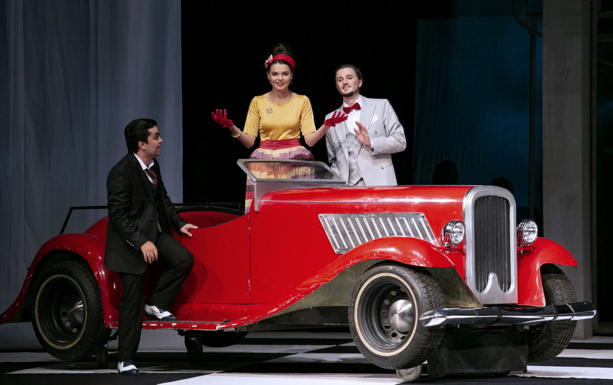 Постановку игривого шедевра с восхитительной – одновременно искрометной и невероятно зрелой, поистине мастерской – музыкой бергамасского мастера сделал известный немецкий импресарио и по совместительству режиссер Ханс Йоахим Фрай. Действие перенесено в благословенный 1950-е – время беспечного европейского веселья после ужасов второй мировой войны, которые все старались поскорее забыть. Не случайно героиня загримирована под Одри Хепберн, а все девушки в спектакле носят расклешенные юбки-колокольчики.