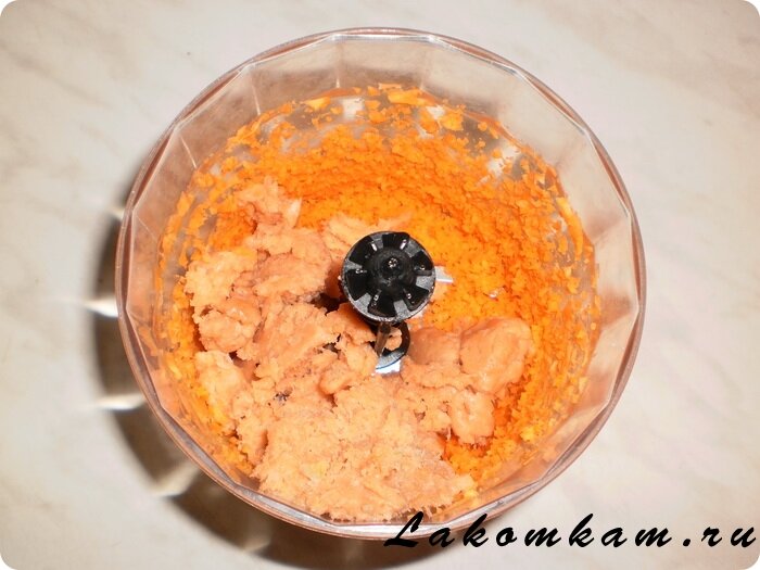 Овощи очищаем, вместе с рыбным филе мельчим в блендере