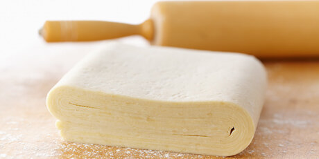 Нам понадобится: 1) на 500 г. муки 400 г. сливочного масла 2)1/2 лимона 3)1/2 стакана воды 4)1/2 ч. л. соли Приготовления: Просеять муку, половину её отделить, смешать на доске с маслом и, раскатать в виде квадрата толщиной 1-2 сантиметра, положить на тарелку и поставить в холодное место. В оставшуюся муку влить 1/2 стакана воды, отжать лимонный сок ( или разведённую лимонную кислоту) и добавить соль, замесить тесто. Скатать его в шар, накрыть его полотенцем и дать полежать 20-30 минут. Затем тесто раскатать так, чтобы получился слой в двое шире и немного длиннее куска теста с маслом, положенного на тарелку. Приготовленное тесто с маслом положить на середину раскатанного, завернуть и защипать края. Таким образом тесто из муки с маслом окажется в конверте. Посыпав стол мукой раскатать тесто (конверт) ровной полосой шириной 20-25 сантиметров и толщиной приблизительно 1 сантиметр. Тесто аккуратно сложить вчетверо, поместить на противень и на 30-40 минут поставить в холодное место. Охлаж