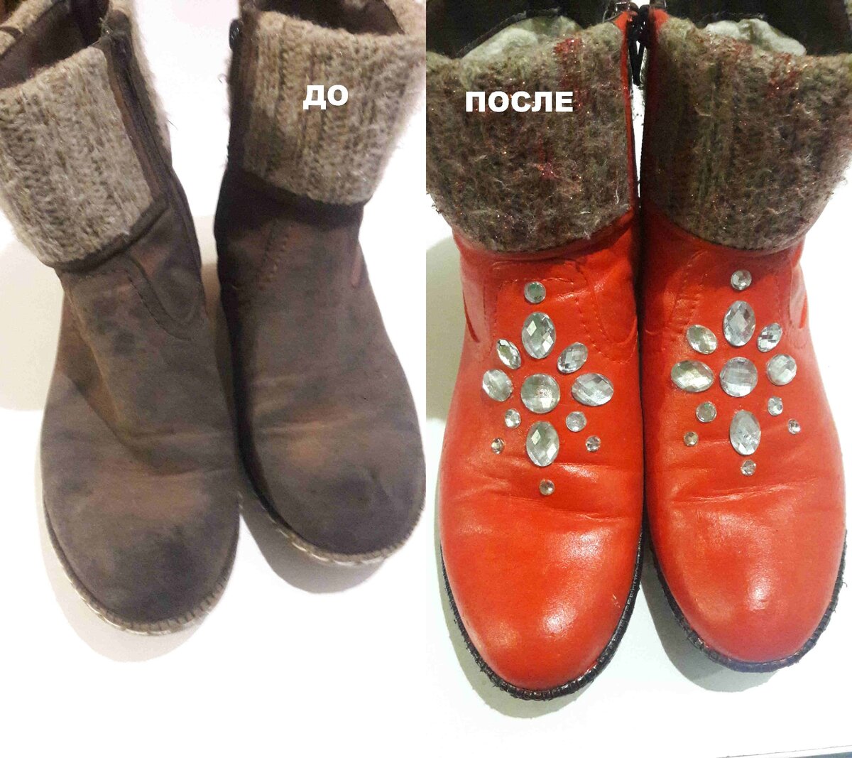 Как обновить старые ботинки? Вдохновляйтесь вместе со мной! Читайте вариант переделки совсем старой обуви. Смотрите как было и как стало: Для переделки я использовала такие материалы: Покрываем ботинки белой краской в 2 слоя с просушкой каждого слоя феном 15 минут: После высыхания белой краски, покрываем ботинки красной краской: Смешиваем красные блестки с клеем для декупажа и клеим их на верх ботинок: Сушим феном. Клеим стразы морозоустойчивым клеем: Красим низ ботинок черной краской. Оставляем сушить ботинки на сутки в тепле. Если через сутки остается липкость - сушим феном до полного высыхания. Вот и все ботиночки готовы. Смотрите видео этой поделки на моем Ютуб канале Лайфхакер DIY Подписывайтесь на мой канал! Пишите Ваши отзывы, ставьте лайки! Поделитесь этой поделкой с друзьями!