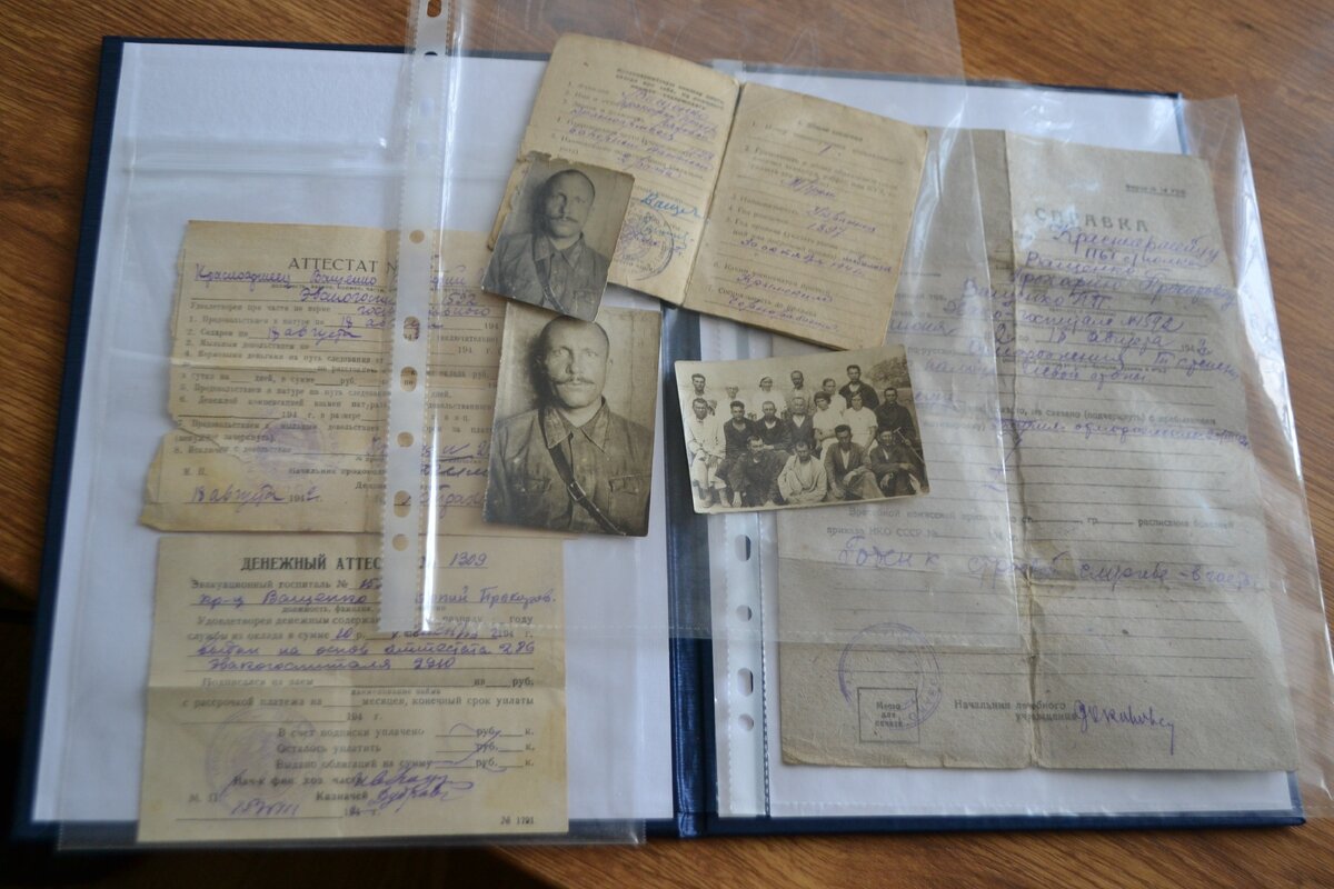Сегодня в зале заседаний администрации Крымского района состоялась передача документов красноармейца, считавшегося пропавшим без вести в годы Великой Отечественной войны. Военный билет, справка из госпиталя, денежный аттестат, продовольственный аттестат и пара фотографий – всего несколько бумажных карточек, но, сколько в них ценности! Документы, принадлежавшие когда-то красноармейцу 1161 сапёрного полка Прокофию Прохоровичу Ващенко, вернулись в семью. Много лет данные бумаги хранились в частной коллекции в Германии, позже их выкупили представители Эстонии, которые стали искать родственников законного владельца документов. Из-за совпадений в географических названиях поиски изначально ошибочно велись в Крыму и только после – в Крымском районе. Оказалось, что именно в нашем муниципалитете, в посёлке Первенец, жили родственники Прокофия Ващенко. В Крымск ценные бумаги привёз для передачи атташе Представительства Министерства иностранных дел Российской Федерации в г. Краснодаре Витали