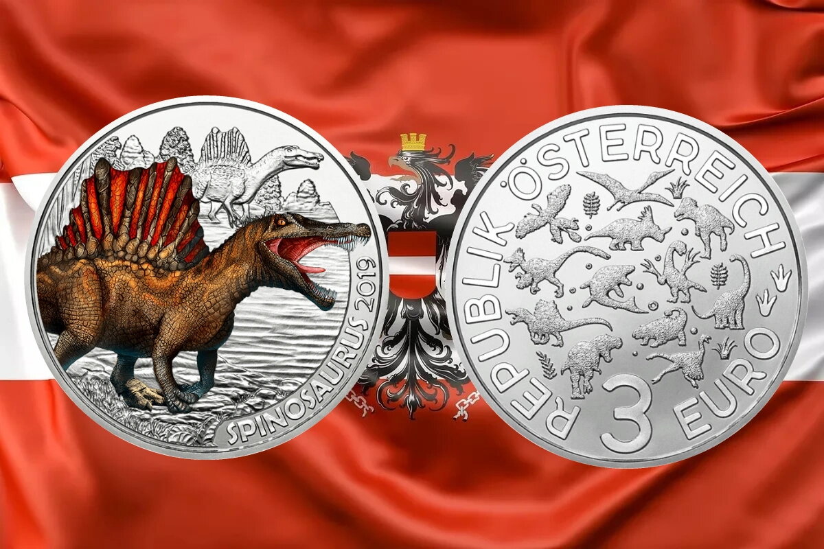 Новая серия монет австрийского монетного двора «Супер динозавры» возрождает этих доисторических гигантов в виде 12 великолепных монет, которые светятся в темноте. С длиной 18 метров и колоссальными 9 тоннами, Спинозавр был крупнейшим плотоядным животным, когда-либо ходившим по Земле, даже превосходя самого культового из доисторических хищников, тиранозавра. Таким образом, Spinosaurus - идеальный способ начать с этой новой коллекции монет. Каждый из 12 доисторических зверей, представленных в серии, обладал исключительным качеством, таким как самые сложные охотничьи навыки, самые длинные когти или самый сильный укус, и это лишь некоторые из них. Эта монета и все серии имеют особенность в том, что они окрашены специальными чернилами, благодаря которым силуэт животного, представленного на изображении, сияет в темноте. Австрийский монетный двор официально выпустил первый экземпляр.