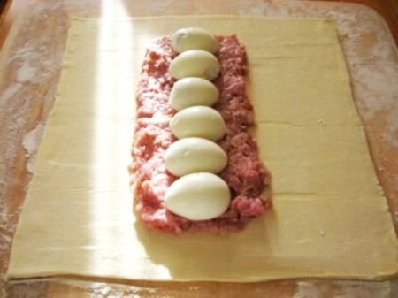 В мясной фарш добавить обжаренный лук, горчицу и большую часть взбитого яйца, оставив немного для смазывания. Перемешать. Отварные яйца разрезать пополам.