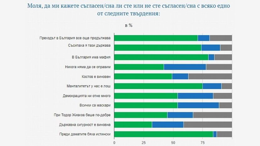 Опрос агентства Gallup international показал, что большая часть населения Болгарии массово поддерживает утверждения, ставшие после 1989 года крылатыми фразами или откровенными клише, без значения идет речь о клише по инерции или это на самом деле является правдой... 45% болгар считает, что при Тодоре Живкове в Болгарии жилось лучше