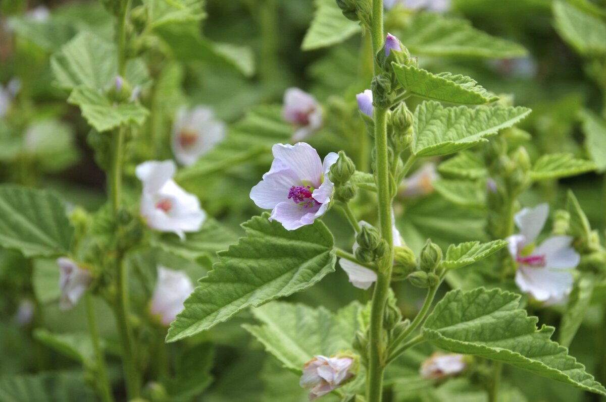 Алтей лекарственный. Семейство мальвовых. Многолетнее травянистое растение с мощноразвитой корневой системой, высоким слабоветвистыми стеблями. Листья очередно расположенные, черешковые, в очертании продолговато-яйцевидные, почти цельные или трех-пятилопастные. Цветки крупные, на коротких цветоножках, с бледно-розовым пятилепестным венчиком. Расположены в пазухах верхних стеблевых листьев. Плод сборный, из многочисленных опушенных плодиков, которые образуют кольцо, замкнутое в чашечку. Цветет алтей и июне-сентябре. Распространен в теплых и субтропических областях Европы, Малой и Средней Азии, на Кавказе, Украине, меньше в Казахстане и на юге Западной Сибири. В медицинской практике используют корни алтея, которые заготавливают преимущественно осенью. С корней удаляют кору. Сушат в пучках при температуре не более 40 градусов. Хранят в сухих помещениях. Срок хранения 3 года. Сырье содержит крахмал, сахар и большое количество слизи, которая обусловливает применение алтея как мягчите