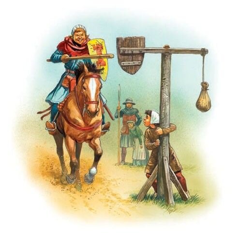 Звучит просто, но как показывают некоторые изображения тренироваться начинали с того, что учились попадать в щит копьем идя пешком, затем катясь на деревянной лошади и уж только потом на настоящем коне.