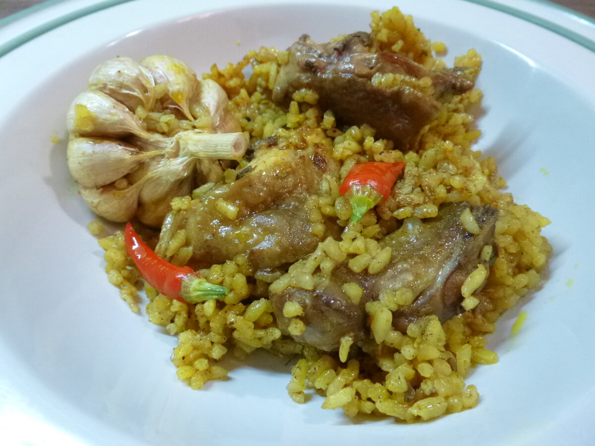 Несмотря на то, что фраза «рис карри» уже подразумевает родину специй – Индию, все-таки предлагаю не перегружать это блюдо приправами. Вряд ли есть смысл класть в одно блюдо не больше пяти специй – они просто «убьют» друг друга. Поэтому сейчас предлагаю ограничиться кумином (зира), паприкой, розмарином и собственно карри. Можно приписать сюда и стручковый острый перец – он тоже в списке ингредиентов. Еще понадобится: Лук Чеснок Курица Розмарин Масло растительное Курица Рис (не пропаренный) Карри Паприка молотая Кумин (зира) Соль Красный острый перец стручком 1. Льем в сковороду масло, разогреваем и забрасываем мелко порезанный лук (1 луковица). Жарим на среднем огне. Добавляем раздавленные зубчики очищенного чеснока (3 шт) и щепотку розмарина. 2. Выкладываем в сковороду куски курицы (500-700 гр). Жарим, время от времени перемешивая, каждый раз переворачиваем куски курицы на не прожаренные стороны. 3. Смешиваем рис (1,5 стакана), карри (1 ст. л.), молотую паприку (