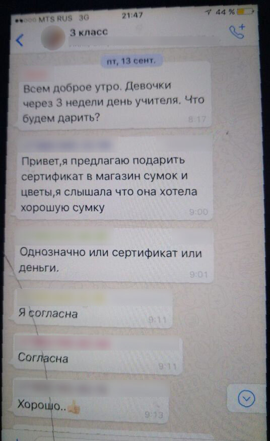 — Да, на День учителя скидывались. Учителю купили букет цветов, а детям в класс — шахматы. Вот это я понимаю, на нужды класса.