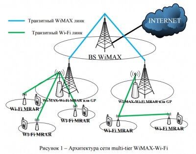 Сетевая архитектура multi-tier сети состоит из сети транспортного уровня WiMAX, а также транзитного уровня и уровня доступа – Wi-Fi, как показано на рисунке 1.