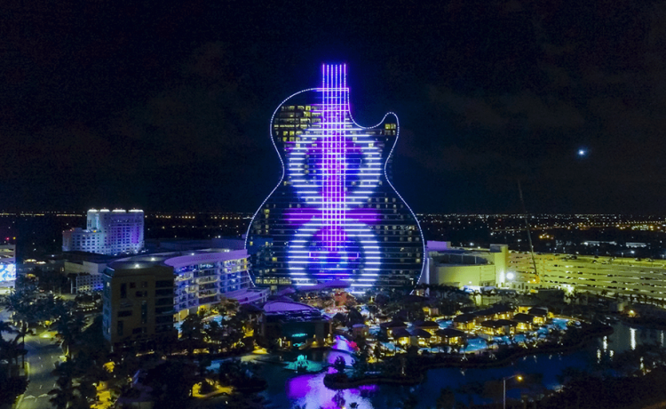 Почти 50 лет неоновые «гитары» украшали вывески перед кафе Hard Rock Cafe, а теперь компания решила поднять этот символ до более высокого уровня. В рамках модернизации отеля Seminole Hard Rock Hotel and Casino в Голливуде, штат Флорида, стоимостью в 1,5 млрд. долларов США, открылся первый в мире отель с фасадом в форме гитары, украшенный огромным световым экраном. 34-этажный небоскреб Guitar Hotel возвышается на 450 метров над горизонтом Южной Флориды, принимая знакомую форму инструмента, в комплекте с шестью струнами, идущими по середине. Ночью световые «пушки» на крыше проецируют струны вверх на высоту до 6 километров, создавая иллюзию грифа гитары. Все здание покрыто светодиодными полосками в количестве 16 800 штук, которые могут загораться независимо друг от друга, отображая разные цвета и узоры с разной скоростью и в разных направлениях. Эти светодиоды можно запрограммировать для создания впечатляющих звуковых и световых шоу. «Перед началом шоу есть момент, когда установка выключе