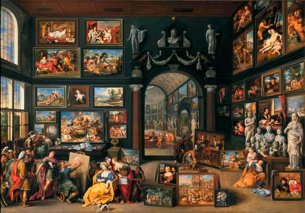 В одной статье я рассказывала историю о том, Как Александр Македонский влюбился в картину. В этой статье, среди многих прочих, была показана картина фламандского художника эпохи барокко Виллема ван Хахта "Александр Великий в мастерской Апеллеса". Виллем ван Хахт. Александр Великий в мастерской Апеллеса, ок. 1628 Картина меня заинтересовала, и мне захотелось узнать о ней побольше. Оставим в стороне сюжет, который взял художник за основу ( о нем можно прочитать в упомянутой мной статье), а поговорим о самой картине. Подобные картины были очень популярны в 17 столетии в Антверпене. Художники на своих картинах изображали собрания картин, скульптур и других произведений искусства. И назывались такие картины "кунсткамеры". Виллем ван Хахт создал несколько таких картин. Одна из них та, что мы сейчас видим. Перед нами как бы изображена мастерская древнегреческого живописца Апеллеса, в которой он работает над своей картиной . Но это, конечно, совсем не так. Ведь полотна, висящие