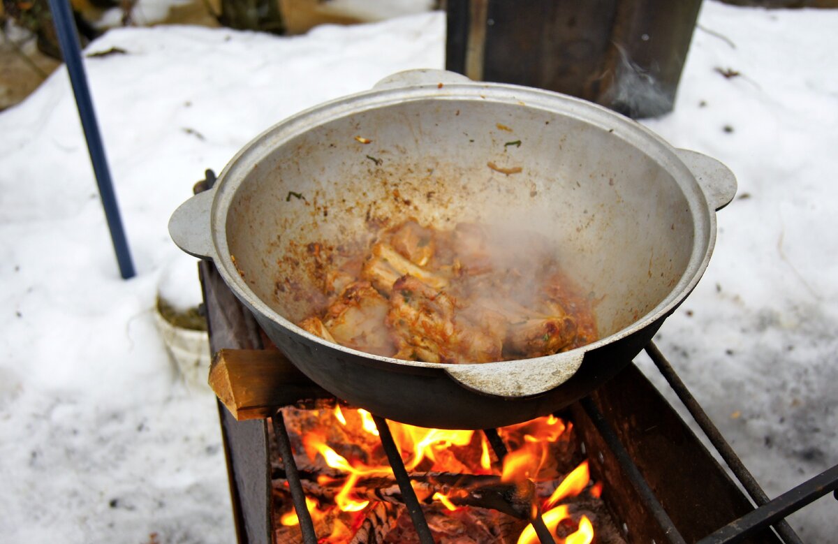 Это было 1 января 2015 года, новогодняя ночь была насыщенная, сытная и веселая, справляли на даче. Конечно, еды осталось много и можно было еще раз стол накрыть, но мы дружной командой решили приготовить еду на улице. У нас получилось что-то между первым и вторым блюдом)) В нашей семье к мангалу женщин не подпускают, все блюда готовят мужики, а я и не сопротивляюсь, ведь новогодний стол практически целиком на мне и мне бы хотелось немного отдохнуть и позволить за собой поухаживать)) Итак, из чего же готовили этот наваристый супец: свинина или баранина, лук, морковь, картофель, баклажаны, томатная паста, болгарский перец, помидоры, специи для плова, соль, перец и вода. Если вам понравился рецепт, ставьте лайк и конечно же подписывайтесь на МОЙ КАНАЛ, завтра будет тот самый новогодний стол, после которого и был этот супчик)) На таком супе конечно не получится разгрузиться после новогоднего стола, ну да ладно, диета была позже)) Очень вкусно подать со сметаной, укропом и чесночком. Кто