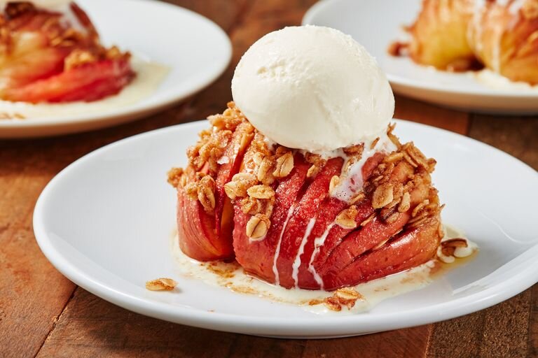 На вкус это нечто среднее между домашним яблочным пирогом и теплой яблочной крошкой. Лучшая часть: вам не нужно иметь дело с раскатыванием и охлаждением теста для пирога. СОСТАВ ПРОДУКТА: 3 больших печеных яблока, разрезанных пополам вертикально и вырезанных сердцевиной 6 ст. л. растопленное сливочное масло 1/4 стакана. сахарный песок, плюс еще для посыпки 1 ч. л. молотая корица 2/3 стакана. овсяные хлопья Ванильное мороженое, для сервировки Теплая карамель ПРИГОТОВЛЕНИЕ: Разогрейте духовку до 350° и постелите на противень пергаментную бумагу. Поместите каждую половину яблока плоской стороной вниз и используйте нож для очистки овощей, чтобы создать тонкие ломтики по всей длине, убедившись, что вы перестали нарезать прямо перед нижней частью яблока (так что бы он остается вместе как один кусок). Переложите половинки яблока на подготовленный противень. Слегка смажьте верхушки яблок 2 столовыми ложками растопленного сливочного масла и посыпьте сахаром. Выпекать, пока яблоки не станут