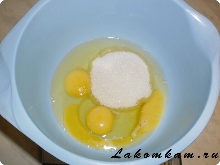 Приготовление шоколадного манника. В глубокую ёмкость разбиваем яйца и взбиваем с сахаром.