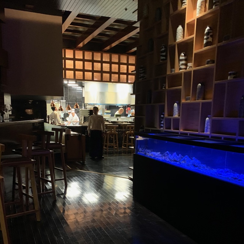 В центре растянулся длинный стол с цветами и бутылками саке. Мягкая мебель низкая. Подушки неудобные. Столешницы на уровне груди. Но сами столы большие. Расстояния между ними правильные. Освещение исключительно искусственное, но точечное над столами, так что еду можно рассмотреть без труда.