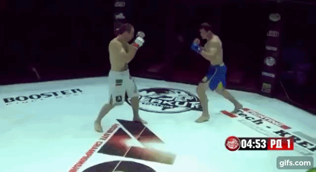 Григорий начинает бой активной разведкой, и пытается подобрать нужную для себя дистанцию этим он пытается обмануть соперника и резко совершает проход в ноги. Чеченец успешно защищается и на выходе пробивает колено в голову. Григорий делает второй рискованный проход, без подготовки и остаётся в партере снизу. Как известно в грэпплинге атакующаная позиция зачастую снизу, но в ММА не всегда это работает так как есть риск пропустить тяжёлые удары или остаться внизу в партере.