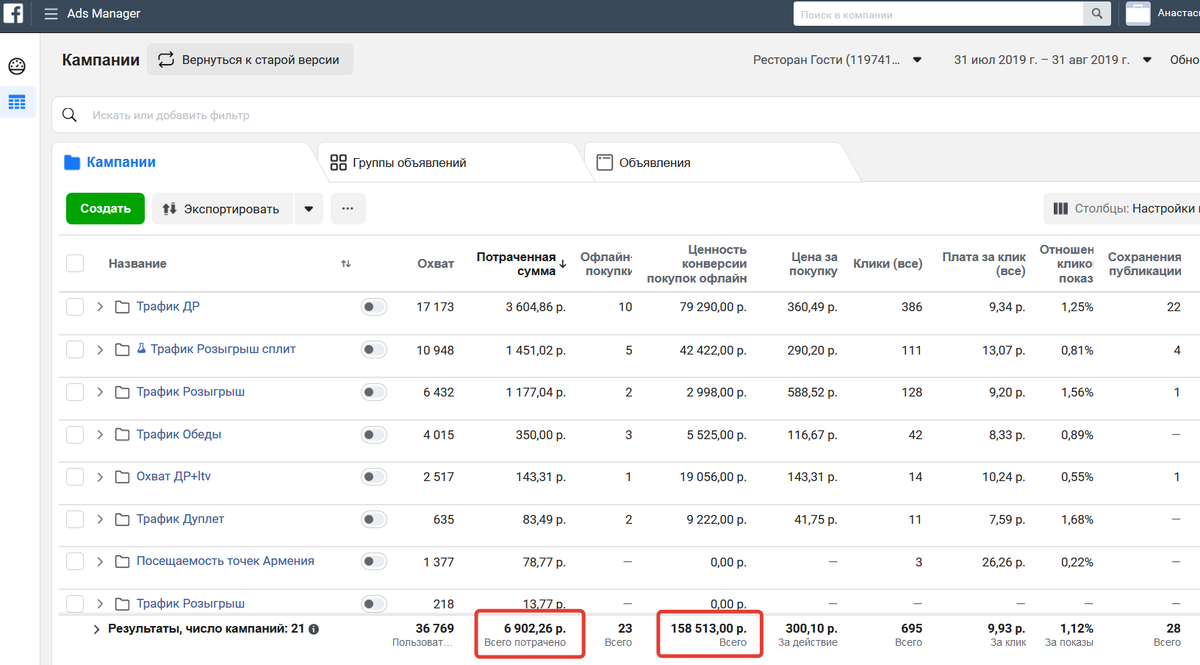 В этом кейсе я хочу рассказать, как потратила в августе 6902,26 руб. на показ рекламы, а пришло с этой рекламы клиентов на 158,5 тыс.рублей. Рекламировала я ресторан @restoran_gosti. Над профилем уже хорошо потрудился администратор Инстаграм, с которым я и сотрудничала. Самое сложное в этом кейсе - это отследить, что клиенты пришли с таргетированной рекламы, потому что каналов продвижения ресторана несколько. Безусловно, существует эффект "телевизора", т.е. чем больше информации о чем-либо мы слышим из разных каналов, тем больше вероятность, что мы это купим. Но как связать тех людей, кто видел таргетированную рекламу и сделал покупку? Я решила использовать такой инструмент, как офлайн-конверсии. Как мне это удалось, ведь в ресторан люди приходят покушать и не отчитываются "я увидела вашу рекламу в инстаграм, вот зашла?" :))) В ресторане внедрена классная система лояльности - все клиенты независимо от суммы чека участвуют в ежемесячном розыгрыше подарков. Чтобы участвовать - надо