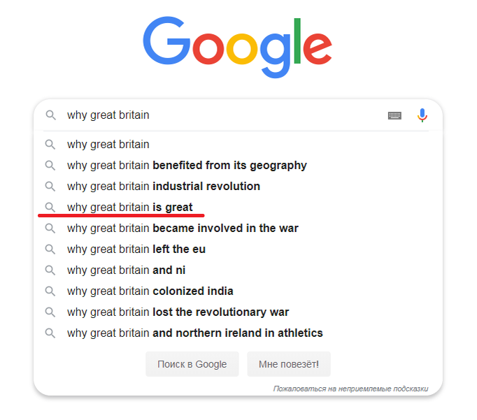 Быть может, не совсем это имели в виду пользователи, задававшие этот запрос. Посмотрите скрин ниже. Но почему Великобритания является великой страной и так ясно, гораздо интереснее разобраться с тем, откуда в названии страны такая беспрецедентная для мировой практики слово. История помнит еще как минимум один случай, когда в названии страны фигурировало слово "Великий". В 1943 году Гитлер переименовал Германский Рейх (Deutsches Reich) в Великогерманский Рейх (Grossdeutsches Reich). С Великобританией же всё произошло куда раньше. Когда речь заходит о создании Великобритании как государства, то отсылки идут к 1707 году, когда был принят Acts of Union, который провозглашал создание единого государства, объединённого в Единое Королевство под именем Великой Британии. Однако, формулировка Великобритания появилась на век раньше. В 1603 году шотландский король Яков унаследовал от своей двоюродной сестры Елизаветы I английский трон. После этого между двумя королевствами возникла личная уния -