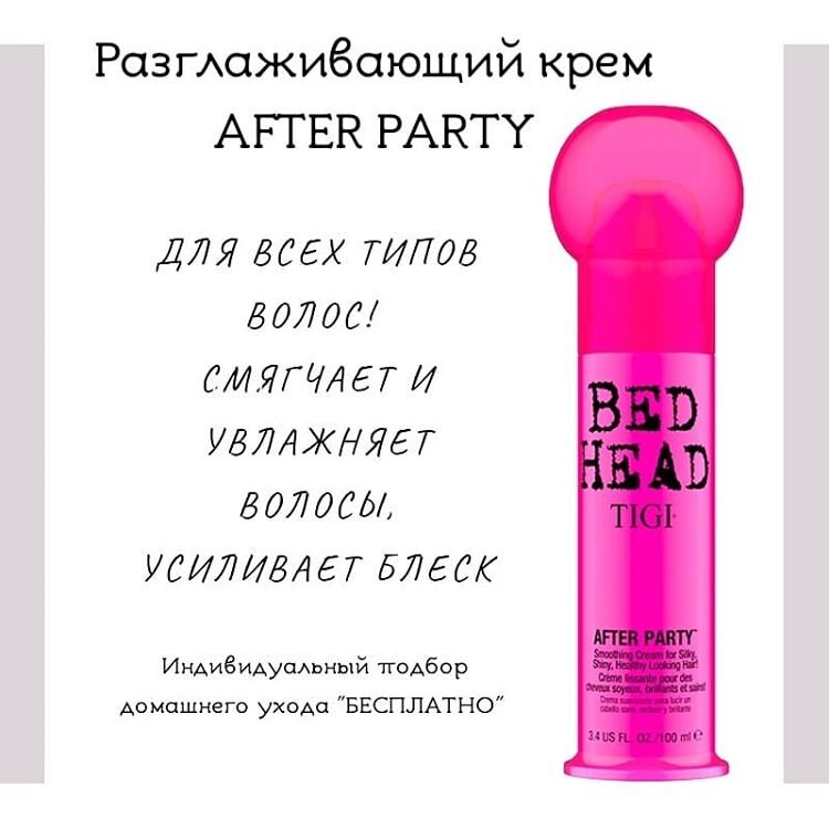 Один из моих любимейших продуктов Tigi Bed head After Party Smoothing Cream! Что это за чудо продукт? Это многофункциональный крем для укладки волос с легкой степенью фиксации и ароматом фруктовой смеси, который с легкостью решает ряд проблем осветленных, пористых, жестких волос, волос после кератина, ботокса, нанопоастики и подобных процедур. Еще у него очень красивая упаковка и он с сияющими частичками. Назначение: Имеет следующие эффекты: Крем снимает стайлинг, убирает вескость лака, обеспечивает бережное расчесывание после причесок и укладок. Увлажнение на 2-3 дня. Особенно актуален для ухода за волосами зимой, когда влажность воздуха низкая и отопительные системы пытаются высушить наши волосы, актуально и для Воронежа. Крем убирает сухость без утяжеления.