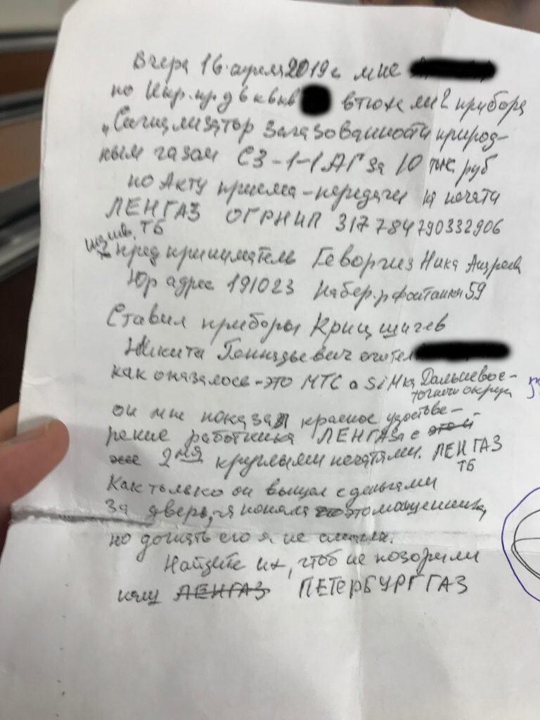 «Вчера мне втюхали прибор «Сигнализатор загазованности природным газом СЗ-1-1 АГ» за 10 000 рублей по акту приема-передачи и с печатью «Ленгаза» с данными предпринимателя Геворгиз Ники Андреевны с юридическим адресом Набережная реки Фонтанки, 59», - пишет автор обращения.