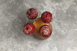 Сегодня мы будем готовить всем известное, но редко повторяемое блюдо - яблоки в карамели Для этого нам понадобится: Начинаем готовку: 1. Моем яблоки под горячей водой с содой, убираем плодоножки и кладем яблоки в холодильник 2. В воде разводим краситель. Наливаем воду в кастрюлю, добавляем сахар и ставим на слабый огонь 3. Постоянно помешиваем и доводим до кипения,после чего перестаем мешать и выпариваем карамель 2 - 3 минуты 4. Снимаем с огня и ждем пока с поверхности сойдут большие пузыри. 5. Берем тарелку и смазываем тонким слоем растительного масла без запаха. 6. Достаем яблоки и протыкаем их палками больше чем на половину 7. Берем яблоко и прокручиваем в карамели несколько раз, обваливаем или посыпаем яблоко посыпкой и ставим его на тарелку Приятного аппетита!!!