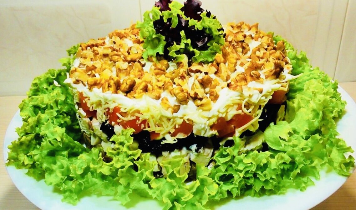 Дорогие мои читатели, так как вам оказалась очень интересна тема новогоднего стола, решила не ждать, а опубликовать сегодня ещё один интересный рецепт салатика. Символ грядущего года – крыса. Этот грызун будет в восторге от сыра и орехов, поэтому салаты на Новый год обязательно должны включать эти ингредиенты. Новогодний салат «Кураж» Нам понадобится Приготовление На смеси из растительного и сливочного масел обжарить шампиньоны вместе с луком. Тарелку застелить бумажным полотенцем и выложить на нее готовые грибы, чтобы они остыли, и впитался лишний жир. Морковь, мясо и чернослив нарезать одинаковыми кубиками. Ядра грецких орехов порубить некрупно ножом. Для заправки приготовить соус, смешав майонез со сметаной и сдобрив его солью с перцем. На большую плоскую тарелку установить разъемное кольцо. В ее центр выкладывать слоями ингредиенты в следующей последовательности: грибы, мясо, сухофрукты, морковь и сыр. Каждый слой щедро промазывать соусом. Сверху блюдо украсить орехами. Зат