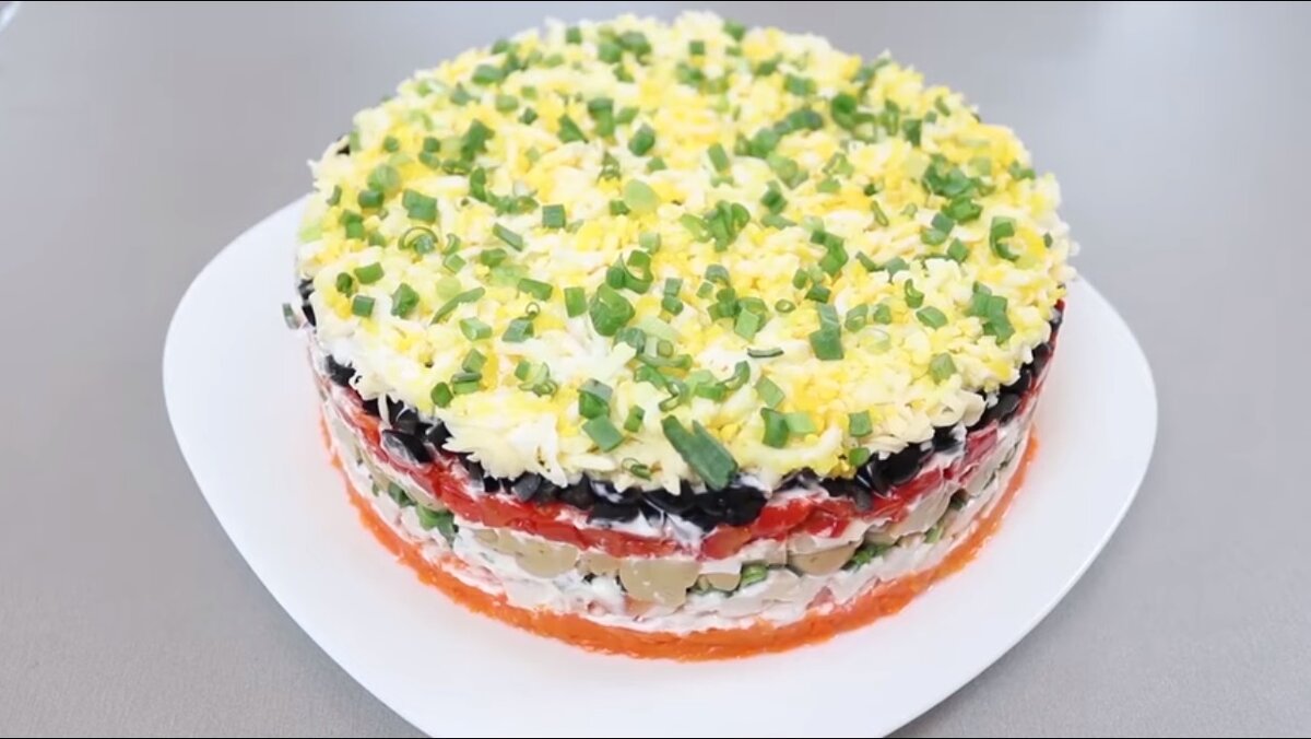 Всех приветствую! Сегодня готовлю красивый, яркий, волшебно вкусный салат! Ингредиенты: Три отваренных моркови натираю на крупной терке. Форма у меня 22 сантиметра. Укладываю первым слоем. Покрываю майонезом. Второй слой будет из копченой куриной грудки. Нарезаю мелкими кубиками. Выкладываю в форму. Покрываю майонезом. Третий слой из зеленого лука. Немного майонеза. Следующий слой из маринованных грибов, которые я нарезала мелко. Майонез. Следующий слой из болгарского перца. Перец я запекаю в духовке в рукаве при температуре 200 градусов 30 минут. Очищаю от семян и кожицы и мелко нарезаю. Вот такой получается красивый красный слой. Черные оливки без косточек мелко нарезаю и укладываю следующим слоем. Покрываю майонезом. Затем идет сырный слой. Натёрла на крупной терке. И заключительный слой из отваренных яиц. Натёрла на крупной терке. Украшаю зеленым луком и отправляю в холодильник на пару часов пропитываться. Вот такой получается яркий, нарядный, праздничный салат. Все продук