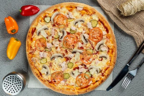 Для приготовления данной пиццы нам понадобится: Для начала необходимо взять 550 грамм дрожжевого теста и раскатать его в небольшой круг, примерно 35 сантиметров в диаметре. Далее необходимо поставить его в теплое место минут на 5-10, смешать майонез с кетчупом, добавить немного аджики и измельченного чеснока. Получившийся соус смазываем на тесто, а сверху кладём 150-200 грамм куриного филе, нарезанного кубиками. Также выкладываем шампиньоны, нарезанные пластиком, поливаем майонезом и кетчупом сверху, кладем нарезанные помидоры и ставим в духовку минут на 20 при температуре 200 градусов по Цельсию. Не забудьте за несколько минут до готовности посыпать пиццу тертым сыром. Также можно посыпать блюдо зеленью при подаче. Общее время приготовления данной пиццы составляет 30 минут ;)